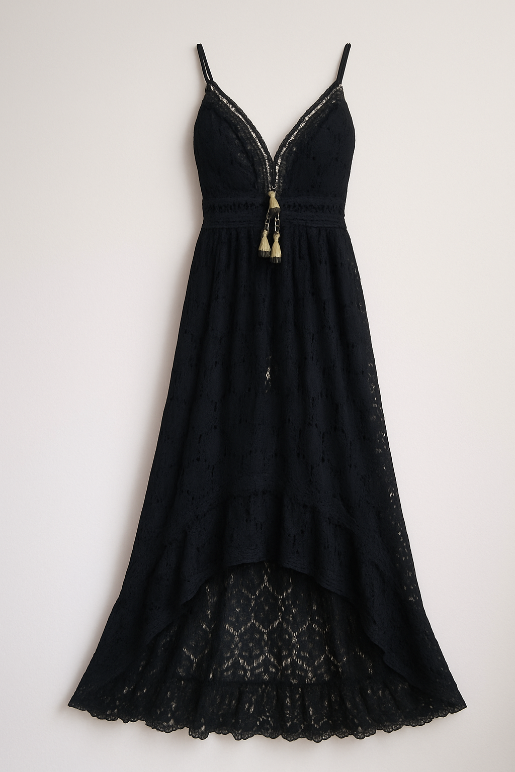 Un elegante abito lungo in pizzo nero, con spalline sottili e un profondo scollo a V impreziosito da dettagli in pizzo e una chiusura a coulisse decorata con nappe dorate e nere.