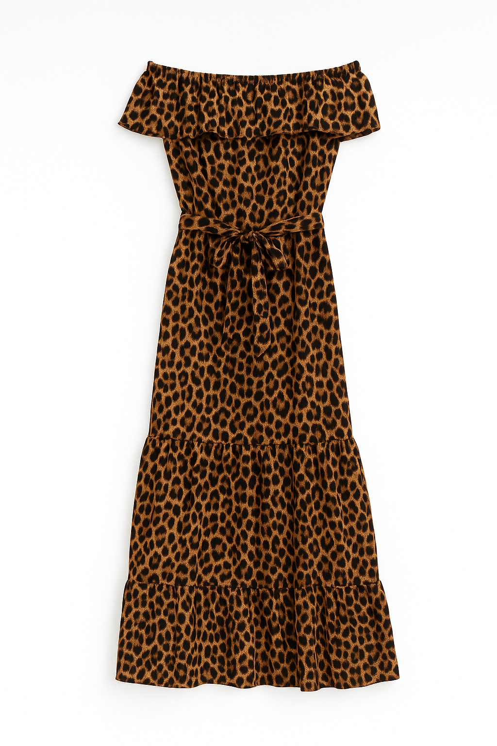 Abito Lungo Leopardato con Scollo a Barchetta e Cintura in Vita