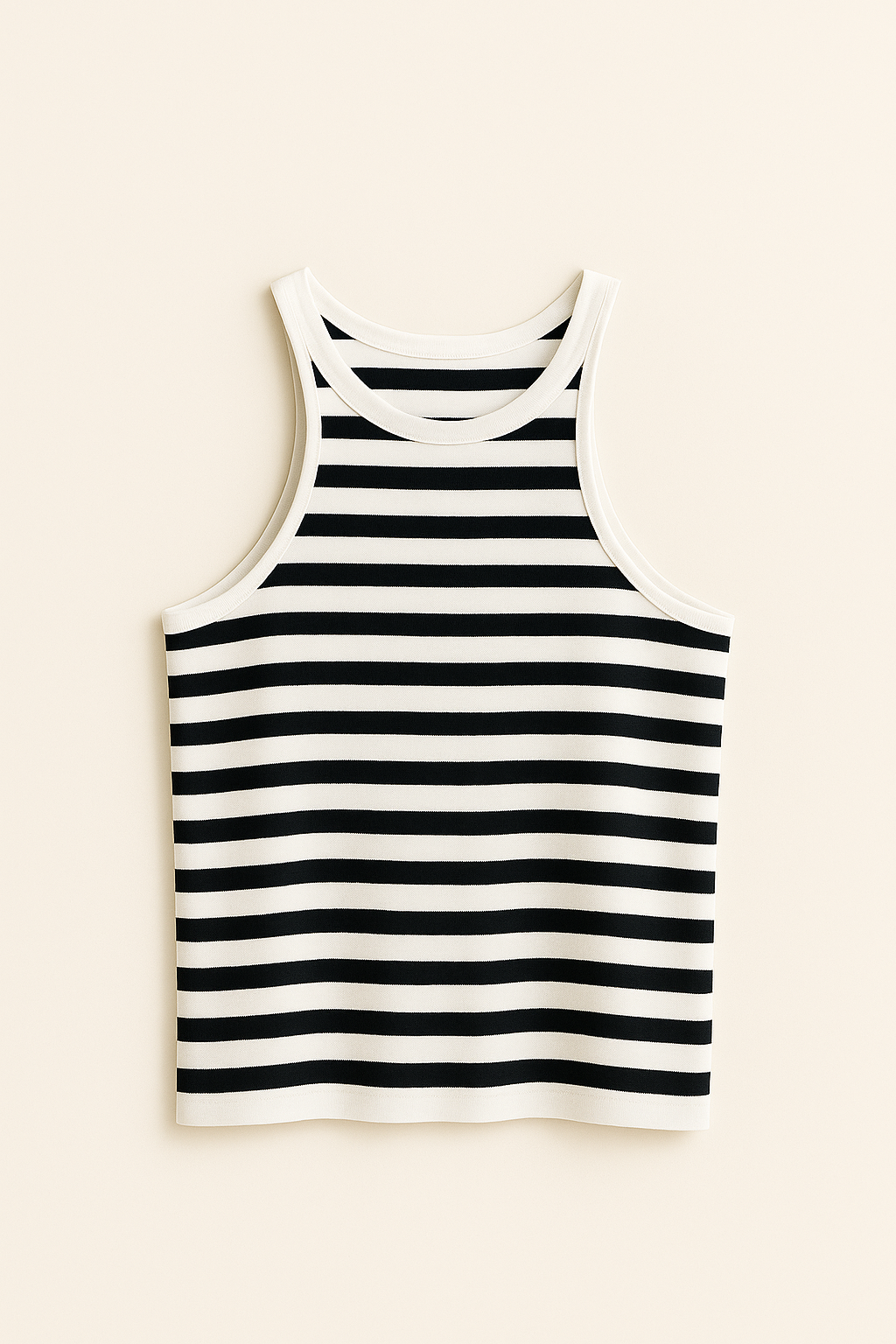Top smanicato a righe dallo stile essenziale e moderno, realizzato in morbido cotone elasticizzato. Un capo versatile da indossare da solo o in abbinamento a blazer e cardigan, perfetto per un look casual ma curato.