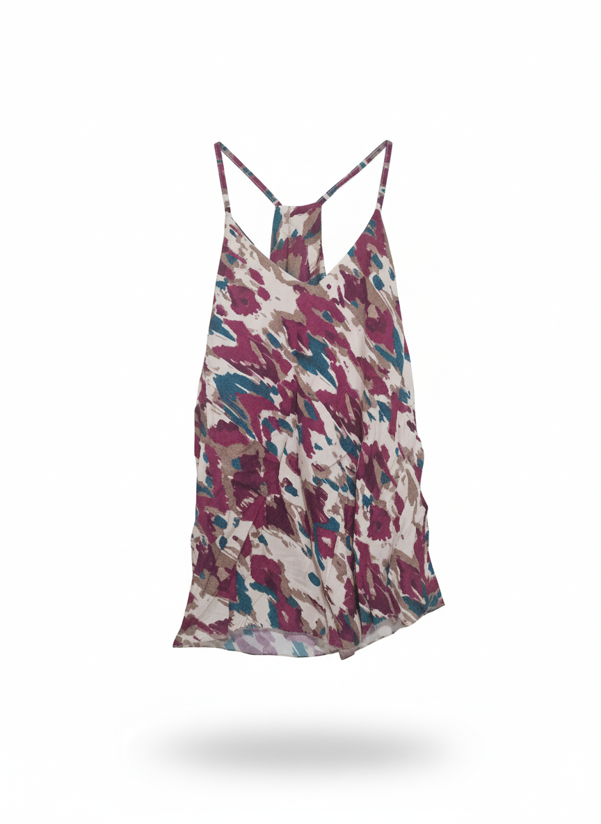 Il capo perfetto per aggiungere un tocco di colore e stile unico al tuo guardaroba. Caratterizzato da una vibrante stampa astratta nei toni del bordeaux, del verde acqua e del beige, questo top è un vero capolavoro di design.
