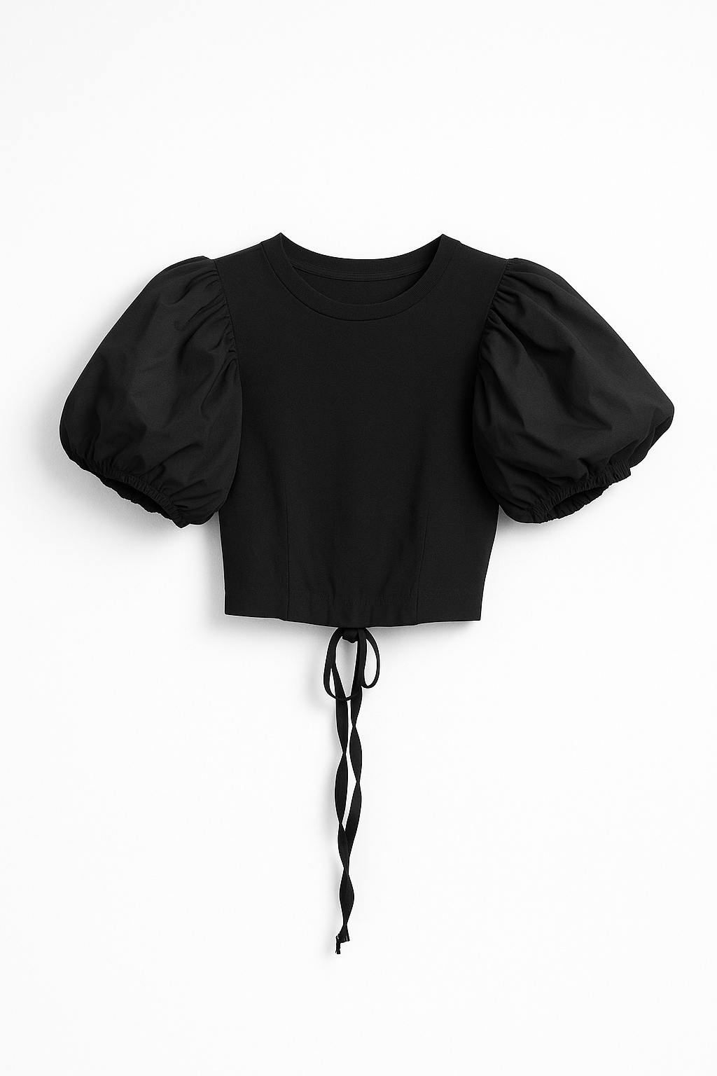 Top Nero Corto con Maniche a Sbuffo e Laccetto